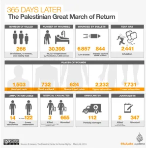 Knowing that the protesters were unarmed, Israeli soldiers stood out in the open, teaching each other marksmanship with high-powered rifles. They are on video, shooting children and then laughing when they hit a human target. Not only did they shoot protesters, but they shot medics and any volunteers who came to carry away the victims to safety. Within the first year, 266 of these brave protesters were killed and over 30,000 injured.