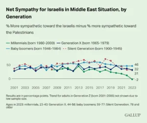 According to a Gallup Poll, Millennials (born 1980-2000) have clearly diverged from older Americans, showing a dramatic increase in sympathy toward Palestinians over a five year period. Whereas GenX and boomers favor Israel by a whopping 32% and 46% respectively, the Millennials favor the Palestinians by 2%.