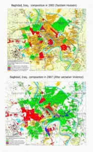 One can observe a subtle difference in the orientations of the Sunni and Shia insurgencies when it came to the invaders. The radical Sunni insurgent view was one of absolute rejection and opposition. Nothing short of the end of the post-2003 order and the expulsion of the Coalition – in other words, national liberation – would suffice. It is therefore no surprise that Sunni militias were responsible for a staggering 90% of attacks against Coalition forces.[11] In contrast, the radical Shia insurgent view was more ambiguous. For them, the Coalition was a vehicle through which Sunni political power could be destroyed and Shia political power cemented. Badr’s and SCIRI’s hijacking of the Ministry of Interior is highly illustrative. The 110,000-strong personnel of the Ministry of Interior could have been used to great effect against the Coalition, but they instead were deployed against Sunni civilians. Rather than fighting the Coalition as such, SCIRI and Badr made sure to secure their own place in the post-2003 order, which they then used against their main rivals, the Sunni forces. The intersection of sectarian politicking and great power militarism would have disastrous consequences for Iraqi society. Once known as a highly pluralistic and multicultural country, Iraq would descend into unspeakable violence, from which it still has not recovered, as can be seen in demographic maps of Baghdad.