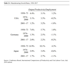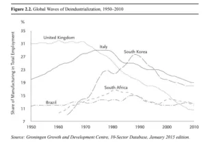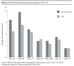 What the data he musters shows is that productivity growth in manufacturing has been relatively high against output growth rates. This is not the sign of a technologically dynamic economy on the precipice of full automation, but instead one of slowed investment that has brought productivity in line with the needs of our diminishing expectations. As the second chart shows, deindustrialization was not a phenomenon limited to the industrial core. Even so-called developing countries followed their industrialized neighbors in hollowing out their heartlands in the 1980s and 1990s with the notable exception of China. Following in the footsteps of Robert Brenner, Benanav places this development firmly in the structure of the postwar economy in which the unique historical conjuncture allowed the United States “to share its technological largesse” with friends and former enemies alike in order to promote unity against Communism.[11] In the end, this practice undermined all those involved as it led to economic free-for-alls in the same highly competitive markets. Reducing manufacturing costs became the name of the game until the incentive to invest in glutted markets became nonsensical to even the most adventurous. Faced with the assault of low-cost competition, U.S. multinationals constructed globalized supply chains in order to ensure the most labor-intensive work was moved to the Global South. German and Japanese multinationals soon followed suit, as they too began to feel the squeeze of overcapacity: a solution that has proved a brake on slowdown rather than reverse deindustrialization.[12]