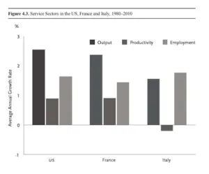 Beginning with the concept of automation itself, he suggests that in popular discourse automation has become a less than useful shorthand for the complete replacement of human labor by technology, a picture that is far too simple. Instead, most of the automation has been labor-augmenting technology or technologies that enhance the productivity of those using them. The consequence of these kinds of technologies is less that all human labor is removed from the equation, and more that much of the human labor required becomes superfluous. For Benanav the changes wrought by these kinds of technologies were “due not to an unprecedented leap in technological innovation, but to ongoing technological change in an environment of deepening economic stagnation,” giving rise to “persistent underemployment,” as opposed to “mass unemployment.”[10] In this sense, Benanav is commenting on the unfulfilled promise of flying cars which prompted Graeber’s essay. Of course, this sober assessment of prospects for the "future that wasn’t" did not come from nowhere. Like Graeber and many other thinkers before him, Benanav plants the roots of our problem firmly in the ground of the late 1960s and 1970s. Looking to trends in manufacturing, he breaks down the developments that have led to a long-term slowdown in advanced industrial economies. As he notes, many automation theorists have taken manufacturing as the test case for all future sectoral automation, an assumption that Benanav seeks to undermine with his own analysis.