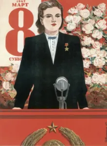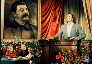 During her field trip, Natasha is tasked by the local plant manager with giving a speech to recognize Alyosha for his achievements in exceeding production quotas. Her impassioned speech extolling Alyosha’s virtues as a worker is surpassed only by her zealous praise for Comrade Stalin who made all of this possible. At the podium she becomes a tableau, reenacting a 1947 International Working Women’s Day poster, all under the kindly gaze of a huge Stalin painting.