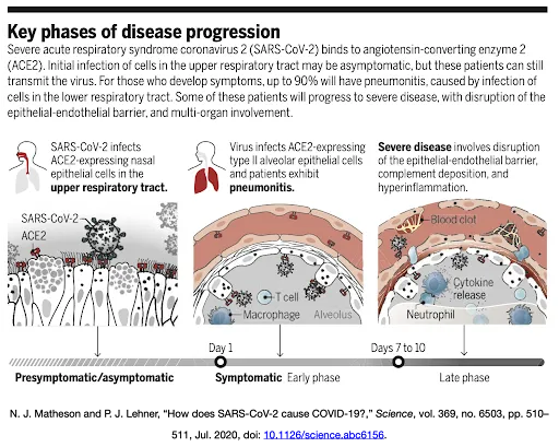 - For further reading that isn't an academic paper, this April 2020 article from Science AAAS "A rampage through the body" by Wadman et al is older, but contains a fairly good description of the disease process and some impacted organs. This February 2021 article, "What it's like to die from COVID-19" by Katherine Harmon Courage describes the experience of severe disease. ↩