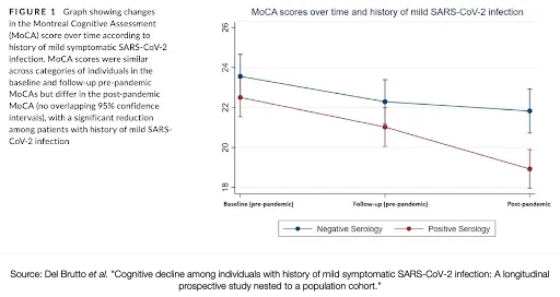 Online studies should be taken with a grain of salt because the experimenter never saw their subjects in person. Another study, "Cognitive decline among individuals with a history of mild symptomatic SARS-CoV-2 infection: A longitudinal prospective study nested to a population cohort " by Del Brutto et al from February 2021 adds some more confidence to this result with in-person clinical practice.[7] It was a longitudinal study conducted in the village of Atahualpa, Ecuador that had been following its subjects since 2013 with MRIs, EEGs, and cognitive assessments. When the pandemic hit, they started looking at 93 patients that had antibodies (“seroconverted”) and evaluated them using the Montreal Cognitive Assessment (MoCA). The MoCA is not a hard test, it consists of items like drawing a clock and naming animals (an example can be found here).