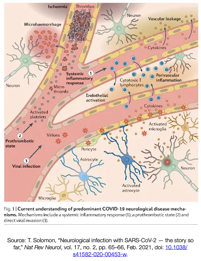 "Neurological infection with SARS-CoV-2 — the story so far" by Tom Solomon gives the clearest discussion I've found as to what might be going on.[40] Solomon points out three different pathways for causing neurological disease: (1) Systemic inflammatory response which leaks cytokines and Cytotoxic T cells into the brain (2) Prothromobtic state which causes clots and micro-hemorrhages to form (3) Viral infection which infects the vascular tissue and some neurons causing inflammation and activated microglia and astrocytes. He wrote: