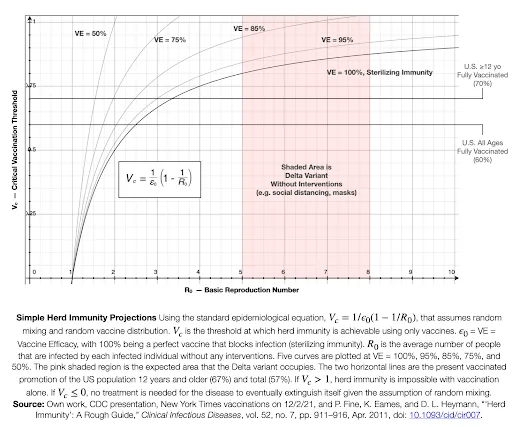 The chart above plots five different scenarios where the vaccine efficacy (VE) is 100%, 95%, 85%, 75%, and 50% along with Delta's characteristics and the vaccination status of the US today. Post-infection immunity gives some protection, but it is not as well characterized. In May 2021, the CDC estimated that 120M people in the US have been infected (~36%). Some of them have gotten the vaccine too. There's some evidence that a substantial fraction of COVID-19 infections do not result in usable antibodies.[43]