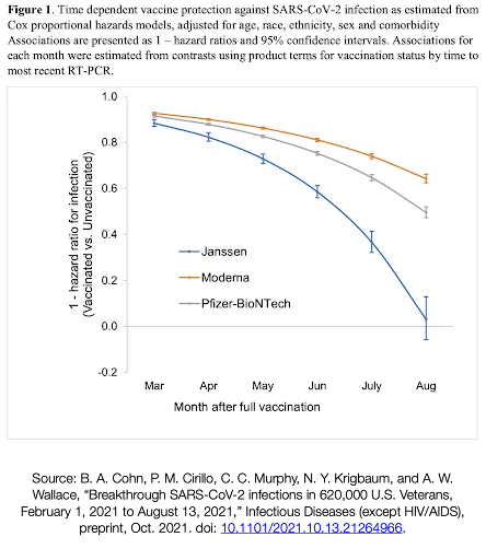 A recent pre-print study of 620,000 Veterans through the U.S. Department of Veteran Affairs health system tracked the efficacy of the three approved US vaccines (Pfizer-BioNTech, Modern, and Johnson & Johnson) over the period of March 2021 to August 2021 and found a substantial waning response in its ability to completely prevent infection (though they still were protective against hospitalization and disease).[44] The population in this study was older, so perhaps they were more vulnerable to this effect. Nonetheless, given that similar information has been coming out of Israel, this tells us that we can't necessarily count on high vaccine efficacy.