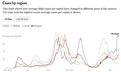 While the current wave appeared to be receding in the U.S. during much of the fall, my wary suspicion is that this is a combination of luck and an artifact of the transition from summer to winter. In the south, hot days cause people to stay indoors. In the north, cold days have that effect. Our national epidemic already shifted north and west, and now it shifts east. Most of the decline has come from the southern states. After its bountiful summer harvest, the reaper is settling in for a new season. Winter is coming.