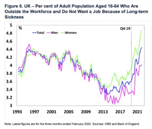 The workforce has shrunk by 440,000 people.… Since Q4-19, the number of people aged 16-64 years that are outside the workforce and do not want a job has risen by 525,000 (1.3% of the 16-64 age population). This largely reflects increases in long-term sickness (roughly 320,000 people) and retirement (90,000), with smaller contributions from lower participation among students (65-70,000) and short-term sickness (30-35,000 people). The share of the 16-64 population who are outside the workforce and do not want a job because of long-term sickness is a record high, with an especially sharp rise among women. I suspect much of this rise in inactivity due to long-term sickness reflects side effects of the pandemic, for example Long Covid and the rise in NHS waiting lists.