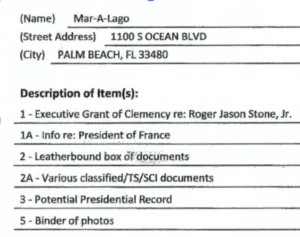 Item "1 - Executive Grant of Clemency re: Roger Jason Stone, Jr." is pretty odd. After all, this document is a public record that can be found online, not something secret. It's not even clear whether this is a copy or an original of Stone's Grant of Clemency. Why did the FBI bother to name this document and not simply label it something like "Potential Presidential Record" as they did to "3 - Potential Presidential Record"? Why would the FBI want to call attention to Roger Stone?