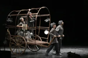Brecht wrote this play in 1939, shortly after the outbreak of World War II following the German invasion of Poland. In aiming to expose the bankruptcy of conventional ideas Brecht’s ouvre contrasts with an Aristotelian theater intended to make us more inclined to follow the norms of society. He wants us to end up with a sense of revulsion at war, and to assimilate the concept that commerce and war go hand in hand, and that commerce benefits in times of war. The simple settings in which this play is usually performed are intended to maximize the "V" effect, of estrangement, and further emphasize the message. Aside from the ones mentioned previously, another example of this is shown below, where Mother Courage’s cart is shown as a bare skeleton.