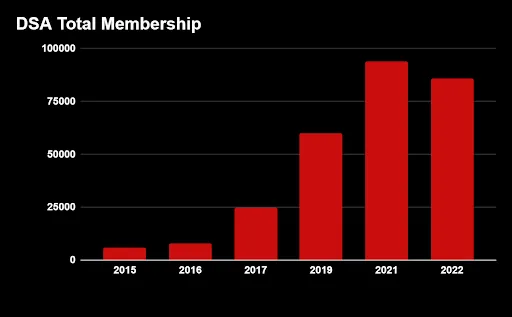 In late 2014, DSA would make the decision to proactively recruit Senator Bernie Sanders to run for President and centralize most of its activity towards supporting his campaign. The DSA has had deep ties with Sanders, fundraising for him in 2006 and with him speaking at the 2007 National DSA Convention. This decision would pay off bigtime, with an exponential growth in membership from 2014 to the Sanders campaign’s dissolution in 2016.