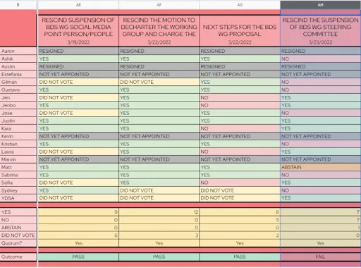 The decision passed in a 9-8 vote. 3 SMC members and the 3 GND members, alongside 1 Emerge, 1 BnR, and 1 Independent voting for. Voting against were 2 BnR members, 2 Renewal, 3 Independent, and 1 vote for YDSA co-chairs.