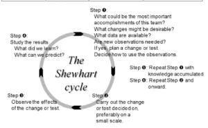 Shewhart also initiated the most important scientific intervention into production of the 20th century. He created a simple formal method for improving any productive process. Later formalized as the “PDCA'' loop, which stands for Plan, Do, Check, Act, is a scientific framework for continuous process improvement.[31]
