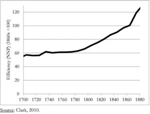With the steam engines perfected by Thomas Newcomen and James Watt, followed by inventions like Edmund Cartwright’s power loom and Joseph Jacquard’s programmable loom, the Industrial Revolution radically altered how work was conducted. These innovations were adopted in a widespread manner, as argued by Andraes Malm and others, in large part as a response to rising class struggle.[4] This was especially as Marx noted because of the creation of a large surplus population to utilize them due to the enclosure of the commons. The essential ingredients for the revolution being private manufacturers contending with petty bourgeois craftsmen, a large mass of available cheap labor, available cheap raw materials from the colonies, and sufficient social surplus to sustain a growing number of intellectuals. Productivity skyrocketed, more than doubling in England from 1700 to 1880.[5]