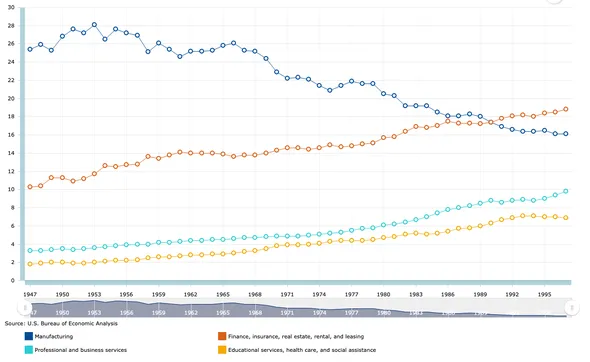 Over a longer timespan, we can zoom in on the relative weight of different major sectors in the US GDP, from 1947-1997.[26]
