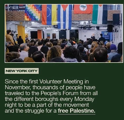 In NYC, I have been active over the past few weeks with the Shut it Down for Palestine Coalition, the largest and most organized group for a Free Palestine in the US. Every week, we have a volunteer meeting that draws hundreds of people. We ground ourselves with a political summary of the week’s events, then split up into sections based on our neighborhoods and plan actions to draw attention to the issue of Palestine. It is this consistent work that allows us to overcome the corporate media blackout and reach out directly to the masses, engaging small businesses, postering and flyering around the neighborhood, disrupting town halls of Zionist politicians, and deploying a variety of other tactics. Countless people with no organizing experience have been drawn in and transformed. Despite an increase in police repression, the movement keeps growing with no signs of slowing down.